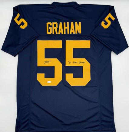 This Mason Graham signed blue Michigan Wolverines custom jersey is a must-have for any fan. The jersey includes an inscription of "Natty Champs" which commemorates the team's national championship victory. Made with high-quality materials, this jersey is the perfect addition to any collection. The Jersey has been certified by JSA.