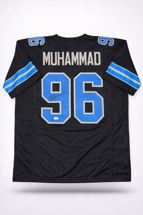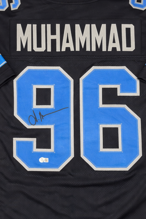 This is a custom Detroit Lions jersey in black, signed by Al-Quadin Muhammad. The jersey is an original, and comes with a Beckett Authentication Services (BAS) certificate of authenticity. It is perfect for any fan of the team or collector of sports memorabilia. The jersey is made for football players and has the team's colors on it. It is a great addition to any collection or as a gift for a fan.