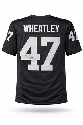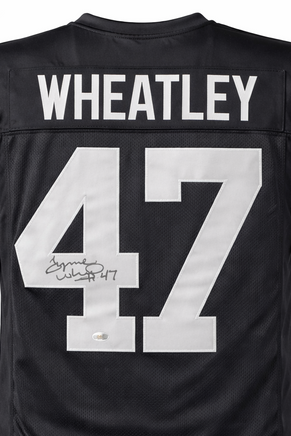 This black custom Raiders jersey is a must-have for any Raiders football fan. This jersey is autographed by Tyrone Wheatley and comes with James Spence Authentication (JSA) certification.