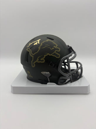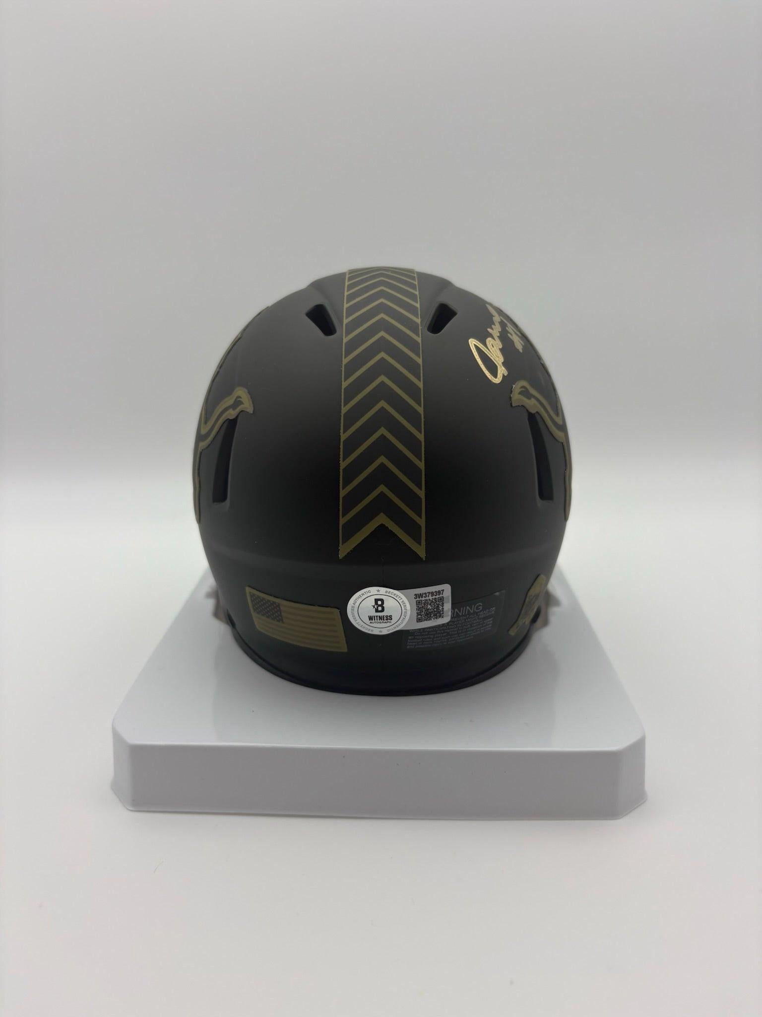 Showcase your love for Detroit Lions with this autographed Salute to Service mini football helmet of Jameson Williams This is perfect for any football fan and comes with a Beckett Authentication Services (BAS) seal of approval. The mini helmet features the number 1 and the player's signature, making it a must-have for any true collector.