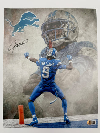 Showcase your love for Detroit Lions with this autographed 11x14 photo of Jameson Williams. This photo is perfect for any football fan and comes with a Beckett Authentication Services (BAS) seal of approval. The photo features the number 9 and the player's signature, making it a must-have for any true collector.