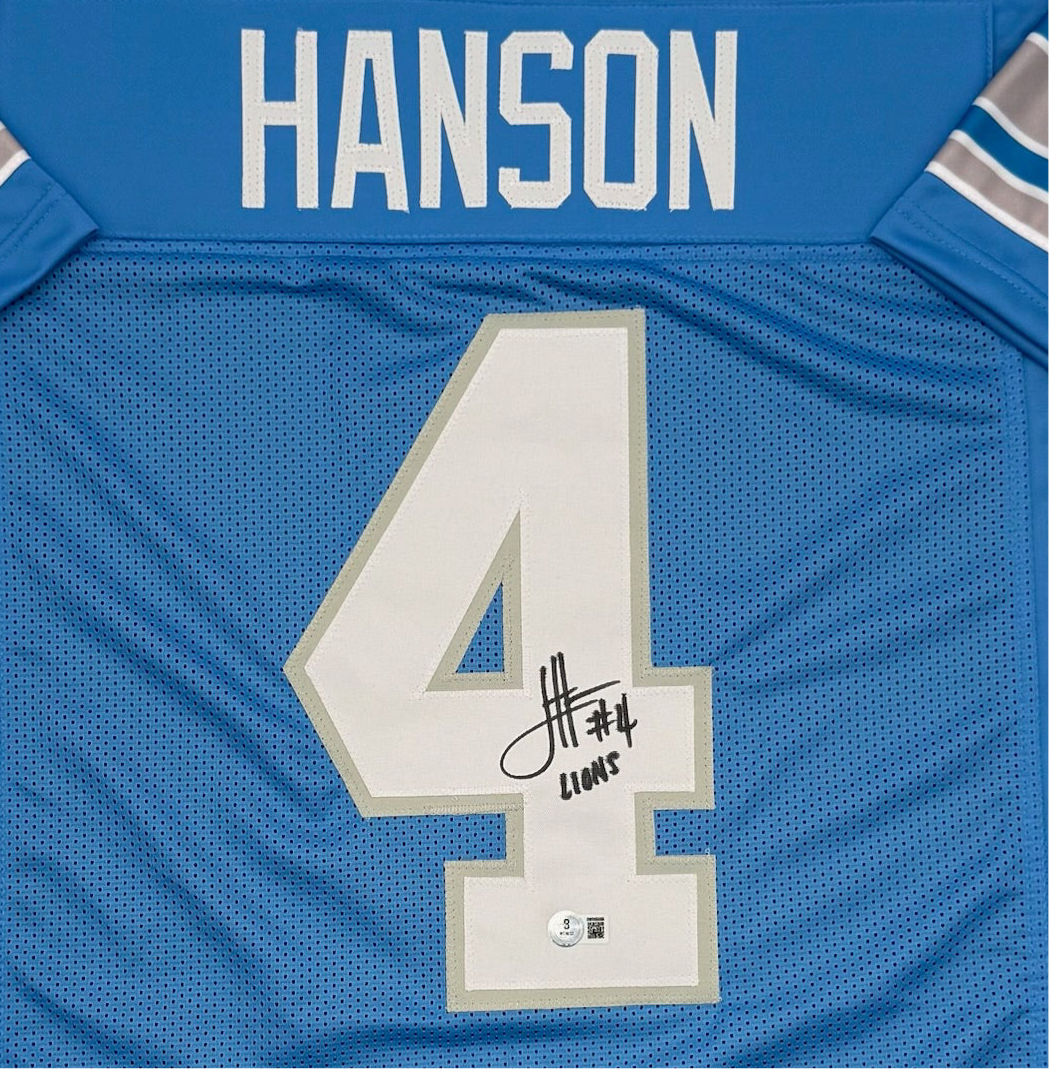This is a stunning blue jersey from the Detroit Lions, signed by the talented Jason Hanson. The autograph has been authenticated by Beckett Authentication Services (BAS), ensuring its authenticity. This is an original piece, making it a valuable item for any football fan. The jersey is in excellent condition and comes with a certificate of authenticity. Get your hands on this one-of-a-kind piece and show your support for the Detroit Lions!