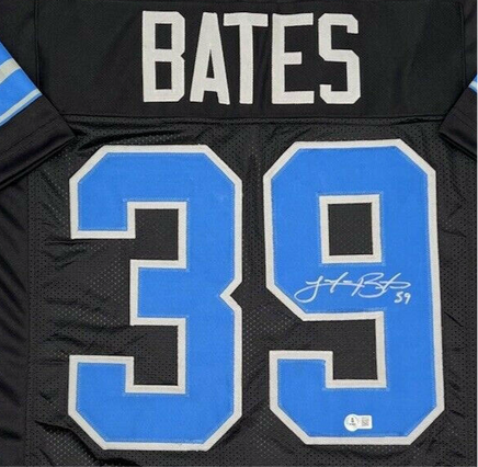 This is a custom Detroit Lions jersey in black, signed by Jake Bates. The jersey is an original, and comes with a Beckett Authentication Services (BAS) certificate of authenticity. It is perfect for any fan of the team or collector of sports memorabilia. The jersey is made for football players and has the team's colors on it. It is a great addition to any collection or as a gift for a fan.