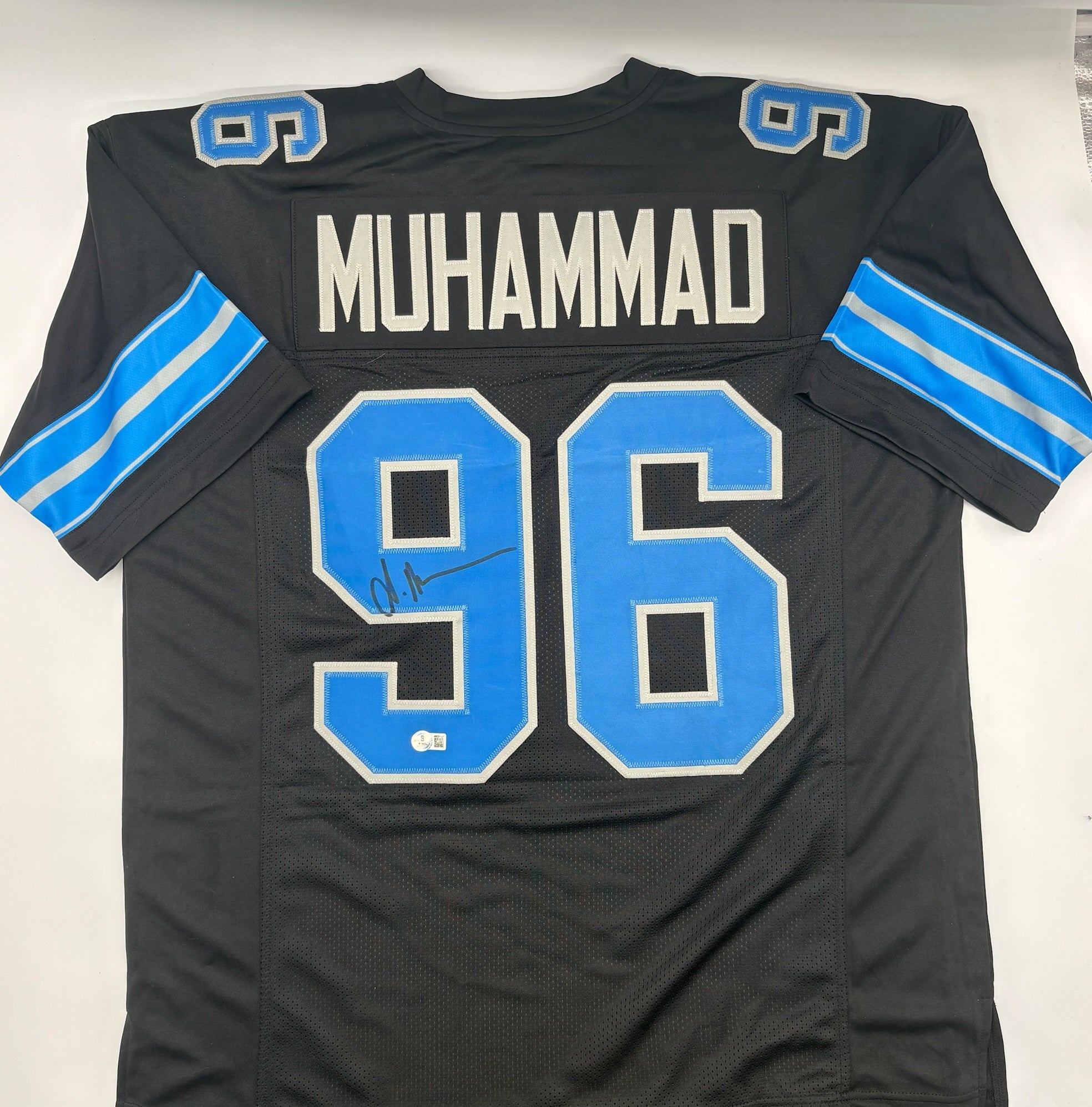 This is a custom Detroit Lions jersey in black, signed by Al-Quadin Muhammad. The jersey is an original, and comes with a Beckett Authentication Services (BAS) certificate of authenticity. It is perfect for any fan of the team or collector of sports memorabilia. The jersey is made for football players and has the team's colors on it. It is a great addition to any collection or as a gift for a fan.
