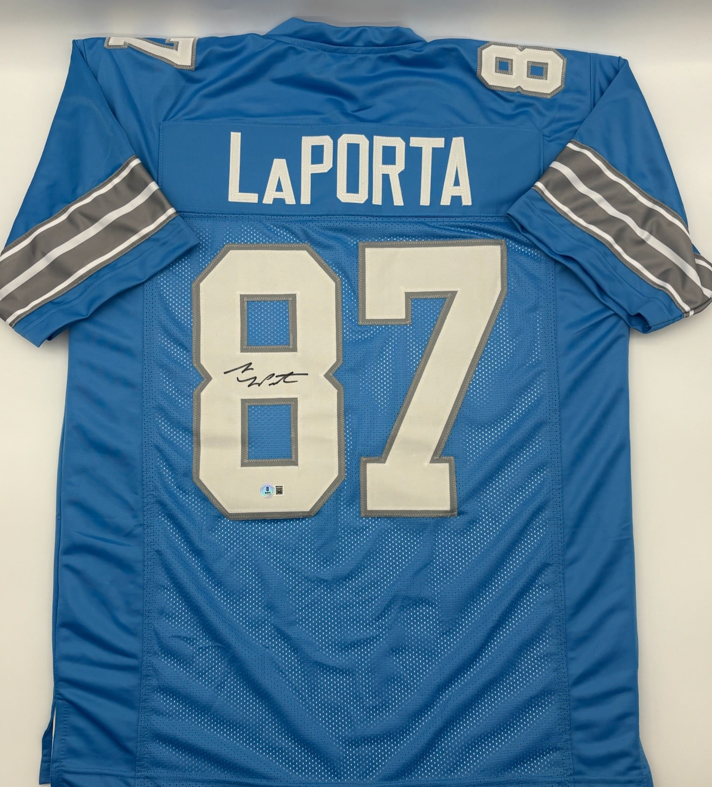 This is a stunning Blue jersey from the Detroit Lions, signed by the talented Sam LaPorta. The autograph has been authenticated by Beckett Authentication Services (BAS), ensuring its authenticity. This is an original piece, making it a valuable item for any football fan. The jersey is in excellent condition and comes with a certificate of authenticity. Get your hands on this one-of-a-kind piece and show your support for the Detroit Lions!