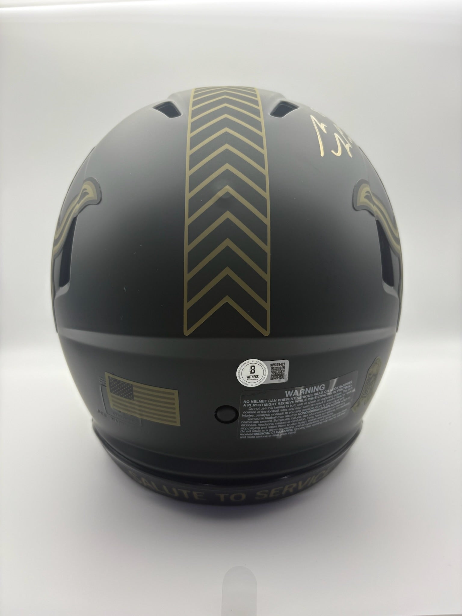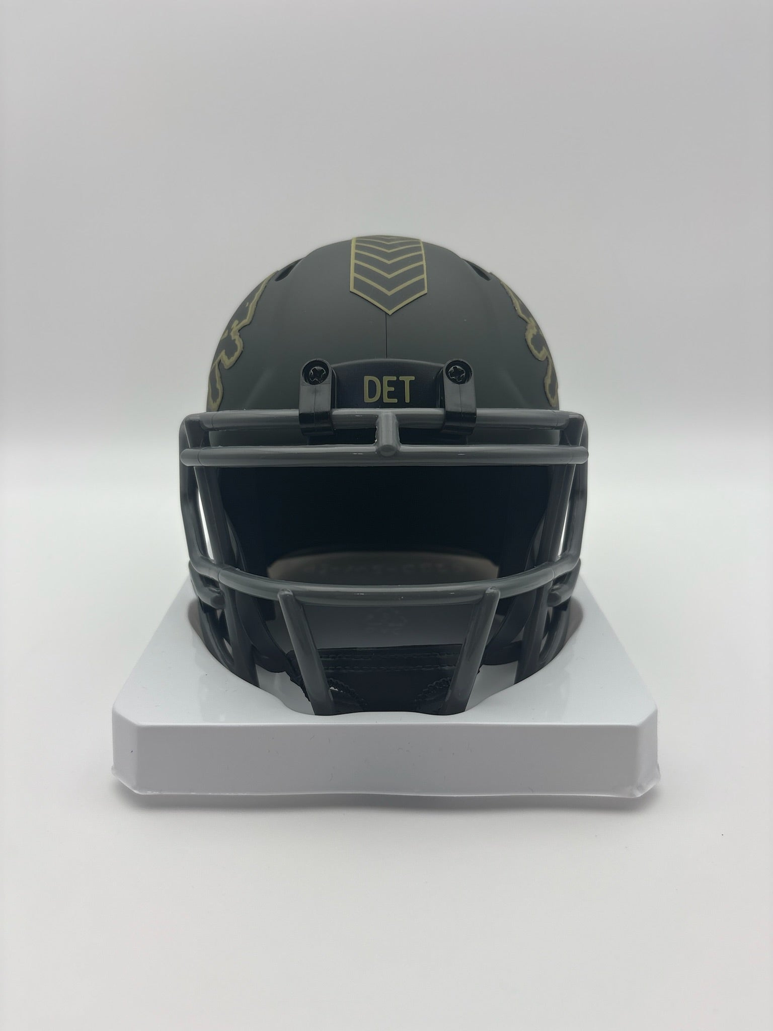 Showcase your love for Detroit Lions with this autographed Salute to Service full size football helmet of Sam Laporta. This is perfect for any football fan and comes with a Beckett Authentication Services (BAS) seal of approval. The helmet features the number 87 and the player's signature, making it a must-have for any true collector.